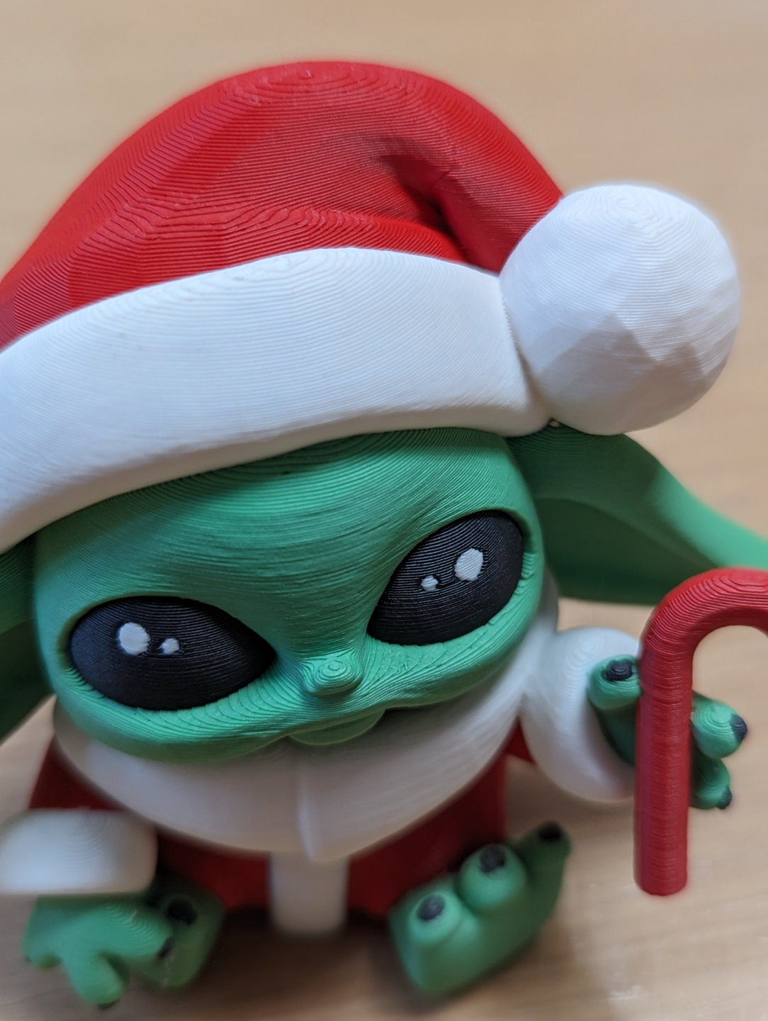 Baby Yoda Navidad Santa Claus Noël. Sumá magia navideña a tu hogar con una pieza impresa en 3D por 3LD. Ligera, resistente y lista para lucirse en el árbol, la mesa o un rincón especial.