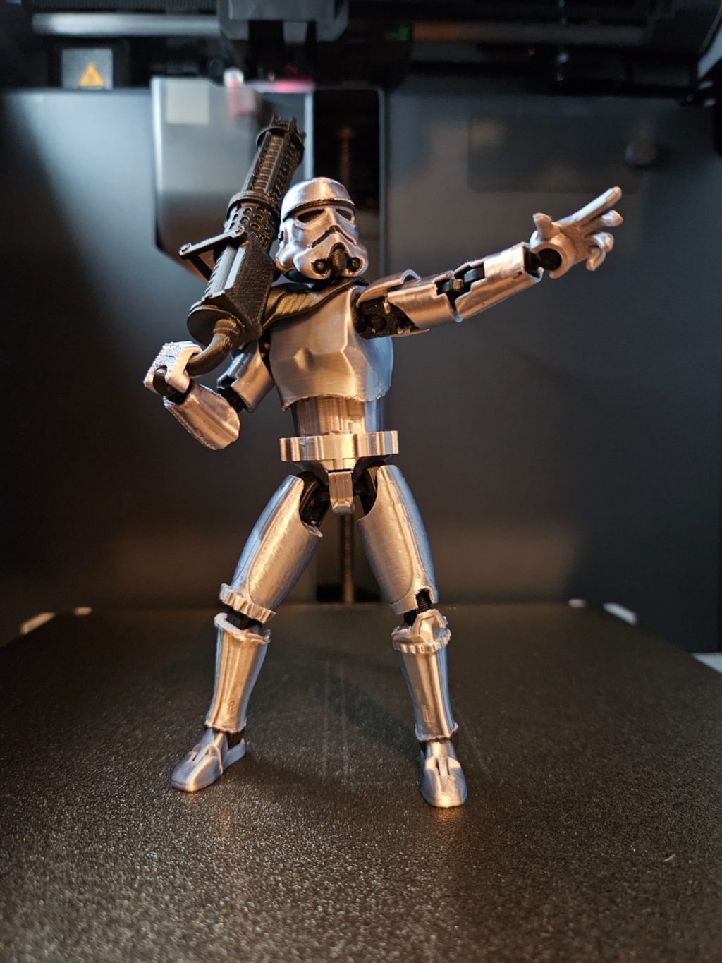 Articulado y adaptable , cada pieza puede tomar la pose que imagines. Además, al estar impreso en PLA, podés pintarlo, tunearlo o complementarlo con impresiones propias.